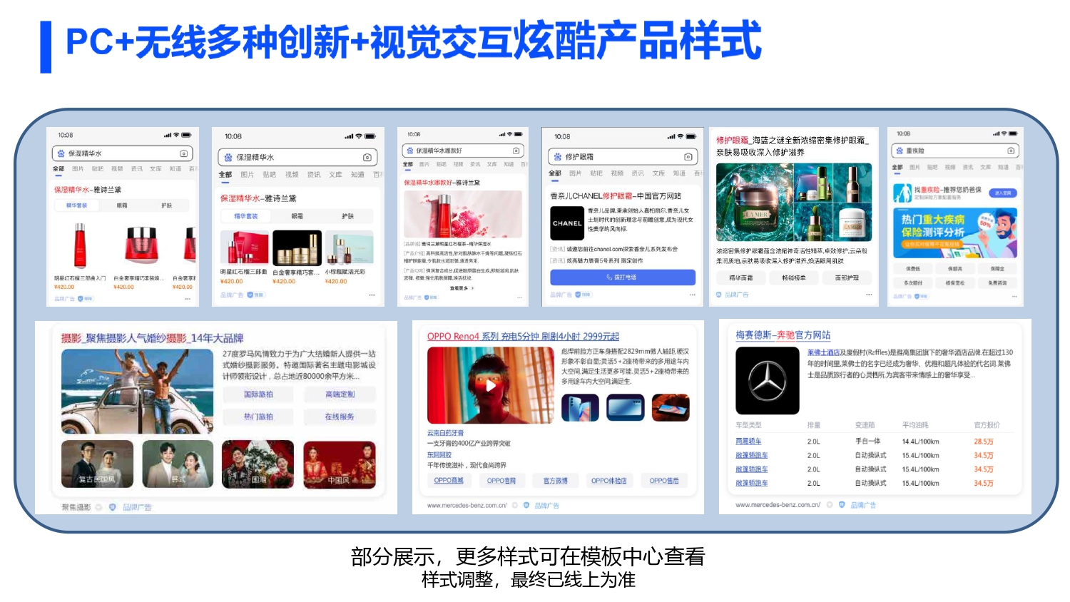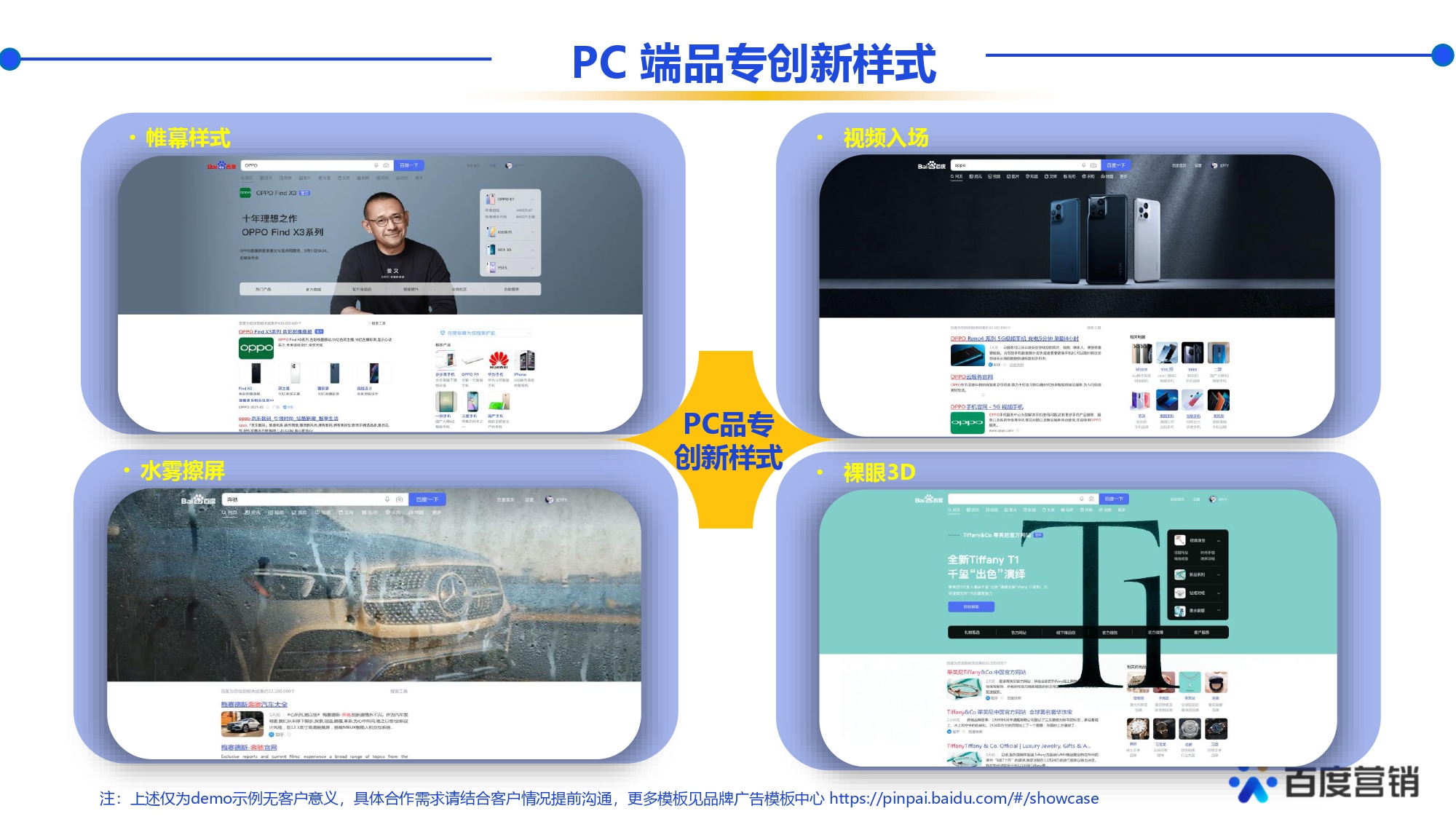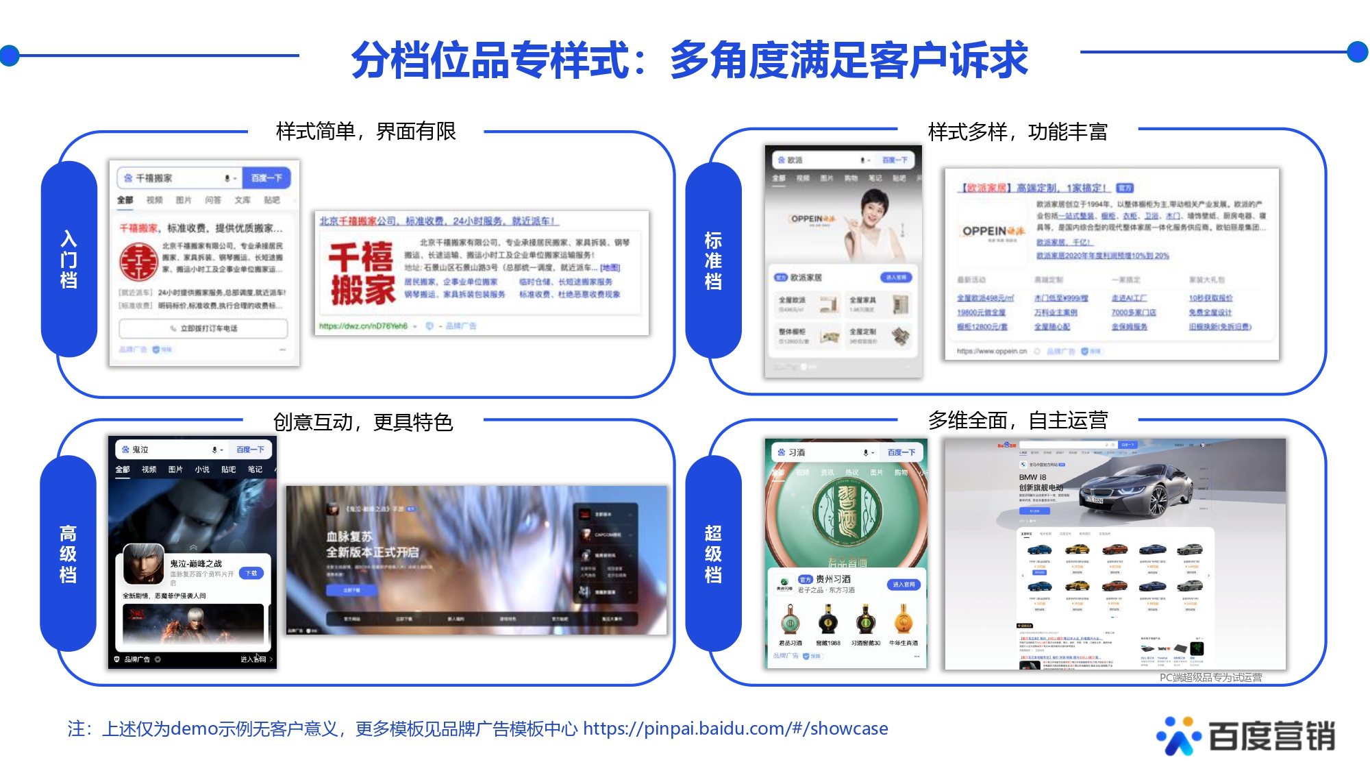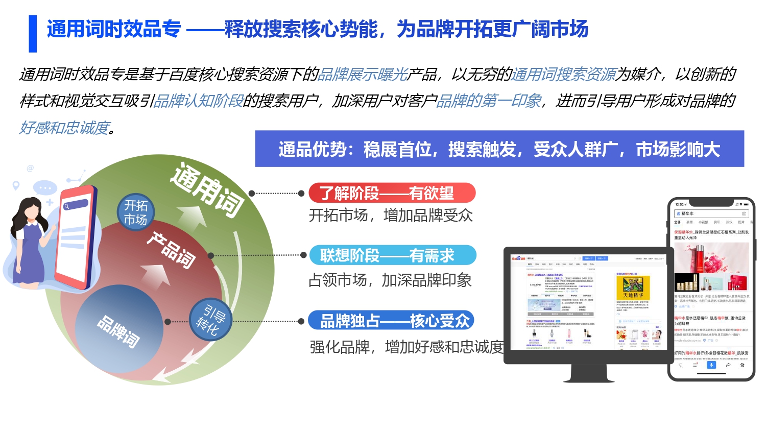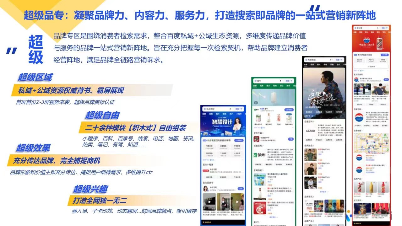 品牌推廣基于百度搜索引擎,通過品牌詞觸發(fā),提供全場(chǎng)景一站式品牌營(yíng)銷服務(wù)陣地,以創(chuàng)新的樣式和視覺交互吸引品牌認(rèn)知階段的搜索用戶,加深用戶對(duì)客戶品牌的第一印象,進(jìn)而引導(dǎo)用戶形成對(duì)品牌的好感和忠誠(chéng)度。