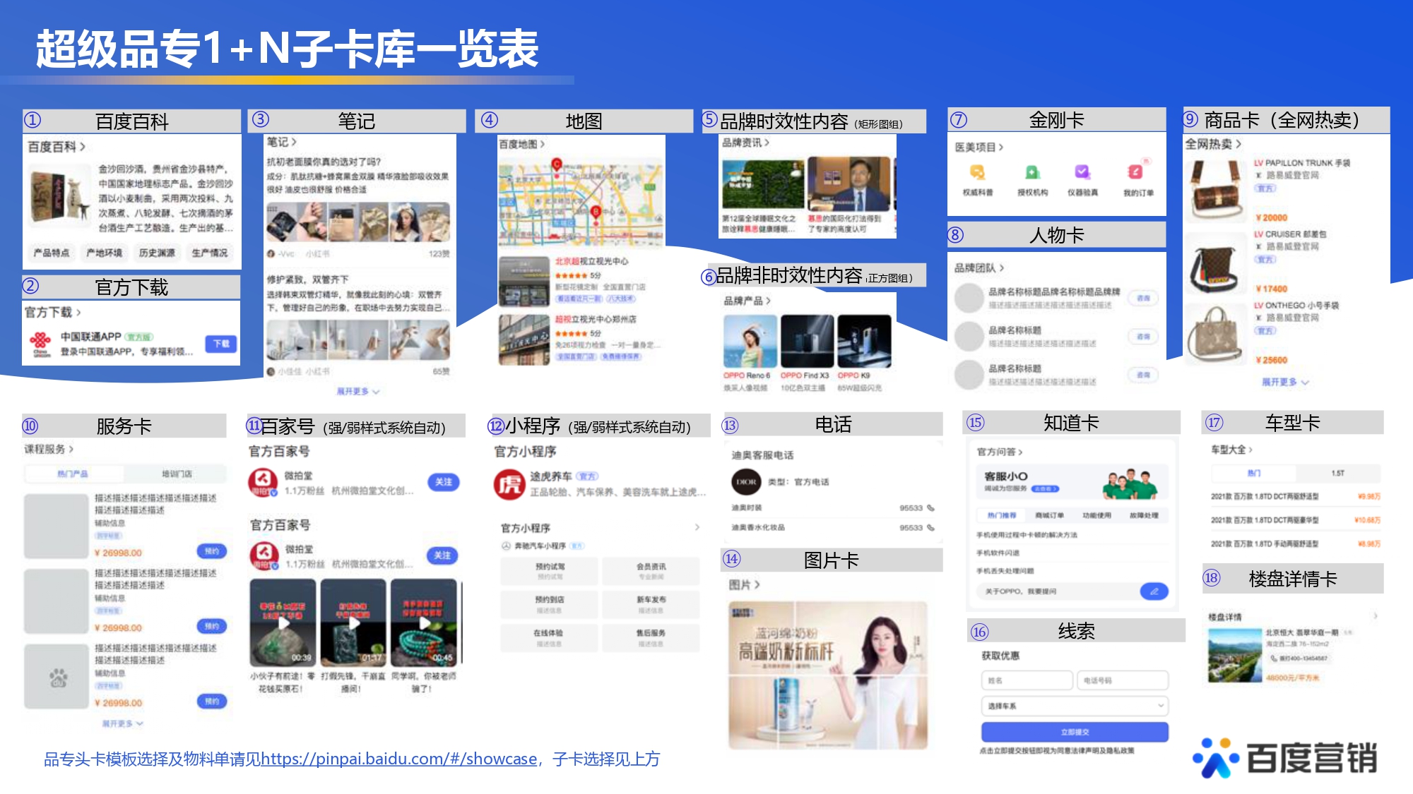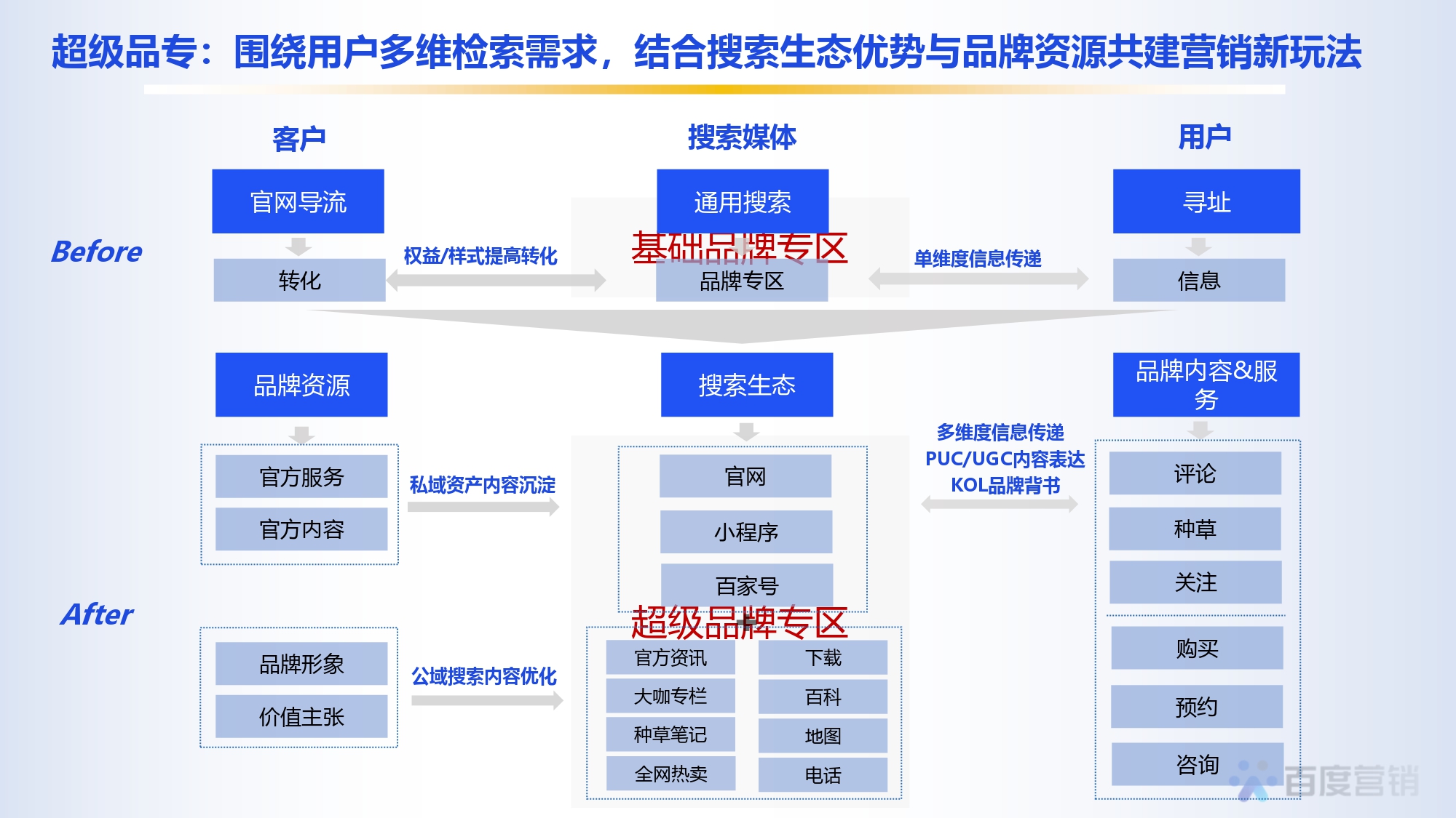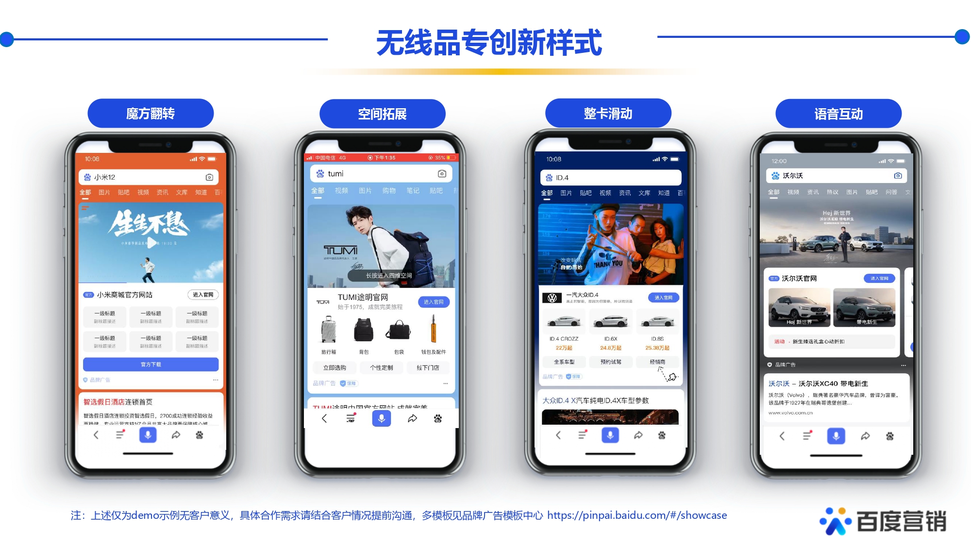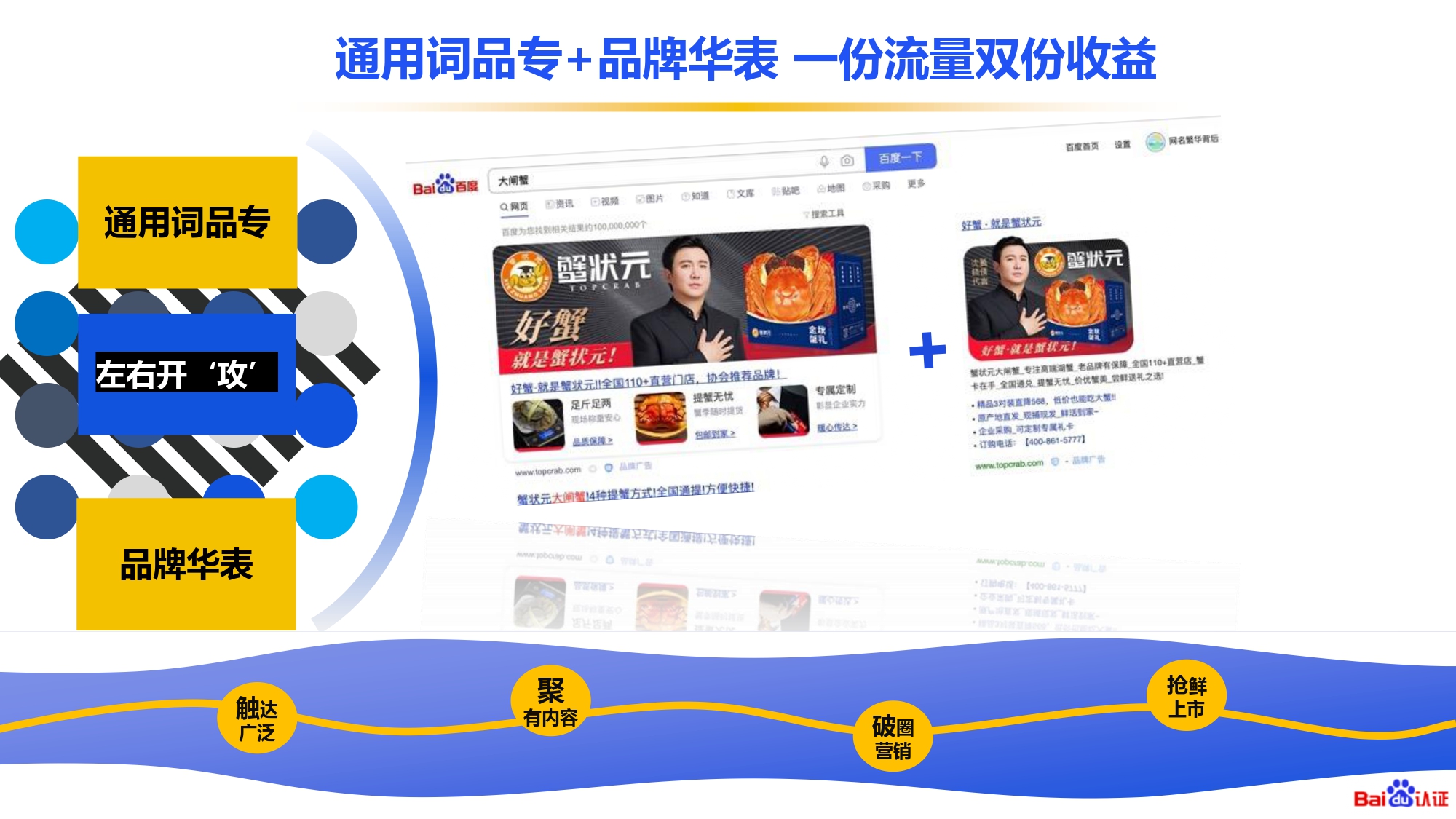 品牌推廣基于百度搜索引擎,通過品牌詞觸發(fā),提供全場(chǎng)景一站式品牌營(yíng)銷服務(wù)陣地,以創(chuàng)新的樣式和視覺交互吸引品牌認(rèn)知階段的搜索用戶,加深用戶對(duì)客戶品牌的第一印象,進(jìn)而引導(dǎo)用戶形成對(duì)品牌的好感和忠誠(chéng)度。